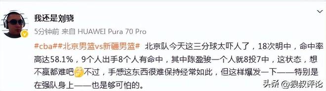 媒体人“我还是刘骁”发文点评:北京队今天这三分球太吓人了,18次明中,命中率高达58.1%,9个人出手8个人有命中,其中陈盈骏一个人就8投7中,这状态,想不赢都难吧[偷笑]不过,手感这东西很难保持经常如此,但这样爆发一下——特别是在强队身上——也是够可怕的。