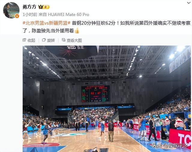 媒体人“勇方方”发文点评:首钢20分钟狂砍62分!如我所说第四外援确实不继续考察了,陈盈骏先当外援用着。