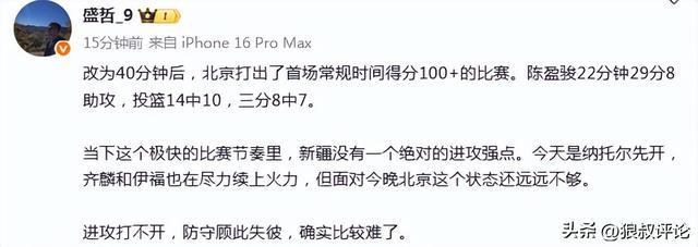 媒体人“盛哲”发文点评:“改为40分钟后,北京打出了首场常规时间得分100+的比赛。陈盈骏22分钟29分8助攻,投篮14中10,三分8中7。