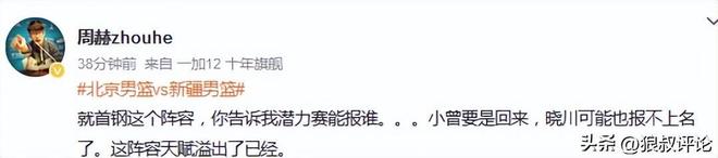 媒体人“周赫zhouhe”发文点评:“就首钢这个阵容,你告诉我潜力赛能报谁。。。小曾要是回来,晓川可能也报不上名了。这阵容天赋溢出了已经。 ”